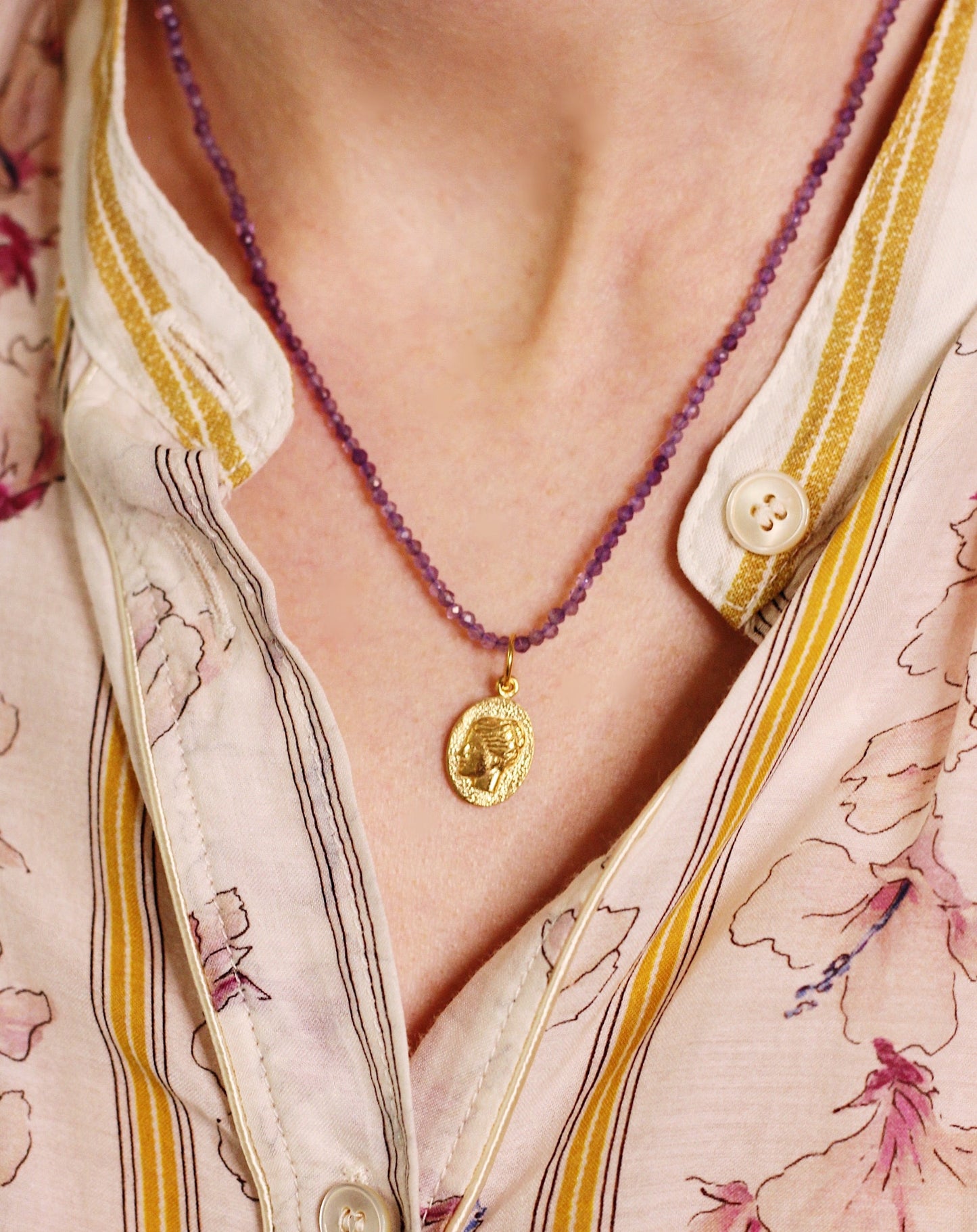 Regular price CHF 40.00A necklace made of Jade semi precious stones and a gold plated silver pendant of Hygieia. Hygieia means "health" in Greek mythology. She was the Goddess of health