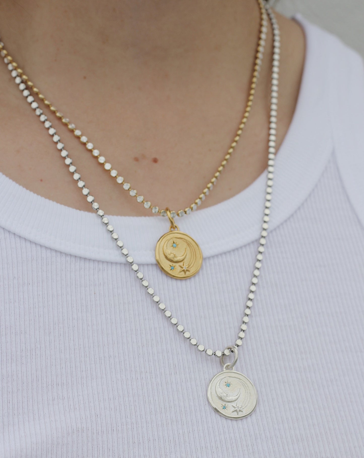 A sparkling necklace with a Luna charm.